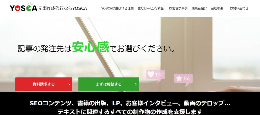 株式会社YOSCA 数千人のライター×編集者。官公庁・大企業の実績豊富。冊子・書籍にも対応。 個別見積 Web以外も含め幅広い編集ニーズがある企業、厳密な品質管理が必要な企業