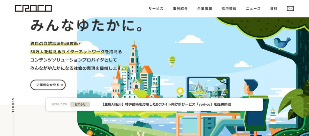 特徴:数千人のパートナーライターと経験豊富な編集者の体制により、大手上場企業から官公庁まで豊富な実績を持ちます。webはもちろんのこと、冊子や書籍などの媒体にも対応可能です。オプションが多く、柔軟なサービスが顧客から評価されています。
