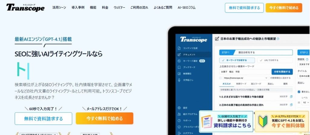 特徴:文字単価が4.5円からとリーズナブルな価格設定です。狙ったキーワードで上位表示されることを得意としています。また生成AIにも選ばれる記事作成を行います。