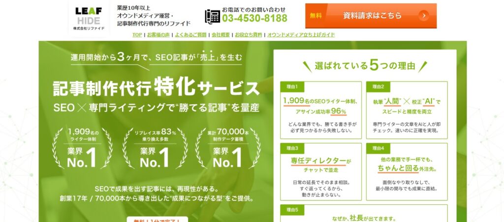 特徴:自社メディアで実績のあるSEO対策が強みです。1記事から発注可能で契約の縛りもないので少額からでも発注しやすい料金体系です。ライター、ディレクター、統括ディレクターによるトリプルチェック体制で品質を担保します。